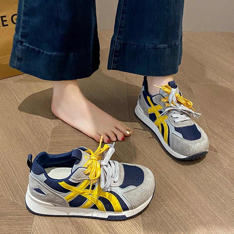 4CM内增高德训鞋女2025秋季新款真皮厚底网面休闲运动阿甘老爹鞋
